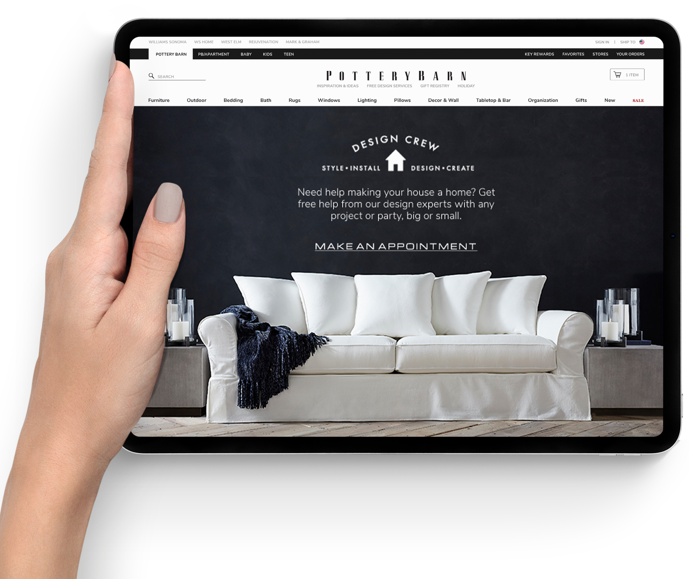 Powered by the SaaS solution Brickworks, I designed a custom experience and interface for Pottery Barn that allowed customers to learn about the free design services offered by Pottery Barn and the larger Williams-Sonoma Family of Brands. This app allowed customers to make appointments with associates for any number of these services. The final product focused on how to bridge the gap between the digital and physical world, helping to convert the online shopper who follows up in-store into a buyer, not just a browser.